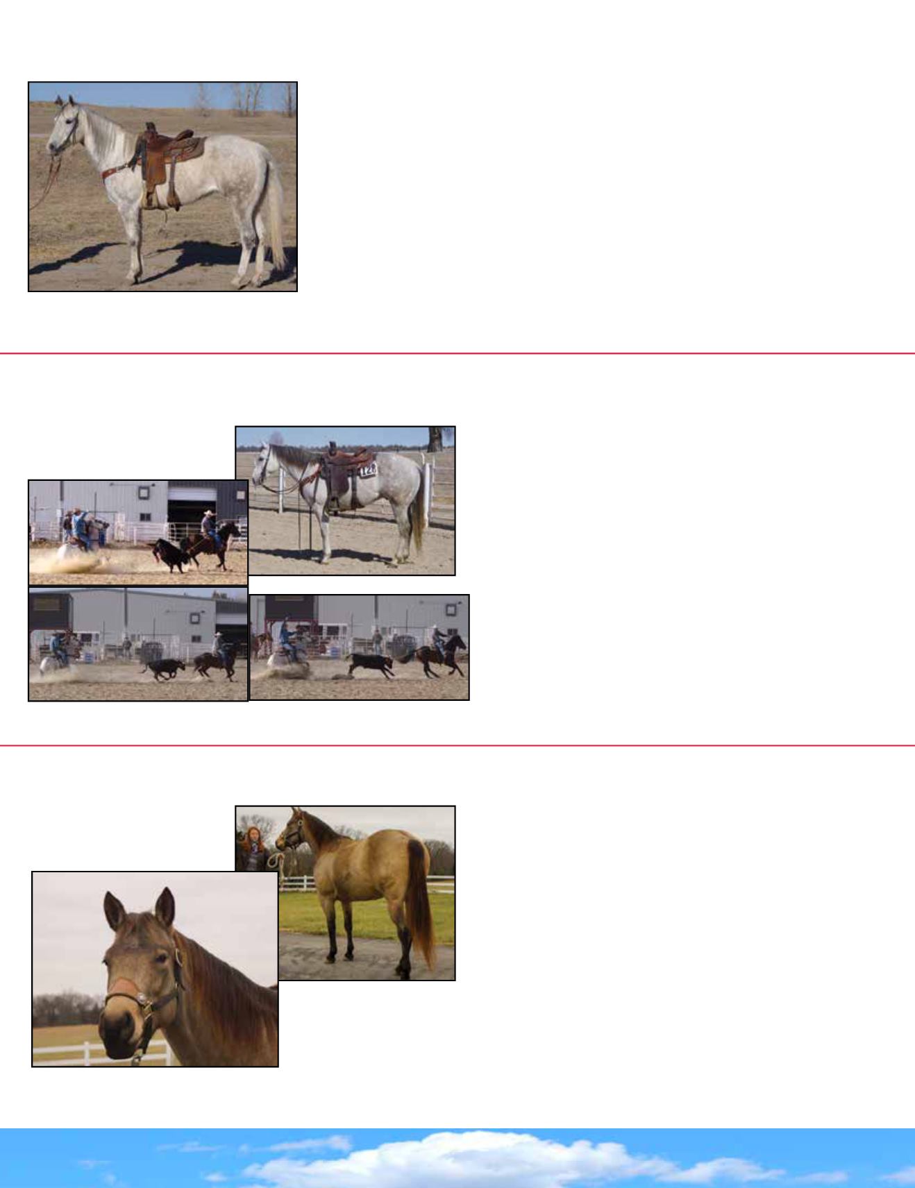 Started twomonth ropingwithPitzer’s. Also used for rough country trail riding. Gentle, broke to hobbles, and haulswell. I have been in the horse businessmywhole life. If you leave hismane long,