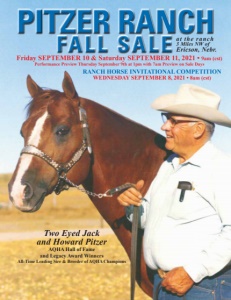 PITZER RANCH FAL L SAL E a t the ranch 3 Miles NW of Ericson, Nebr. Friday SEPTEMBER 10 & Saturday SEPTEMBER 11, 2021 • 9am (cst) Performance Preview Thursday September 9th at 1pm with 7am Preview on Sale Days RANCH HORSE INVITATIONAL COMPETITION WEDNESDAY SEPTEMBER 8, 2021 • 8am (cst) Two Eyed Jack and Howard Pitzer AQHA Hall of Fame and Legacy Award Winners All-Time Leading Sire & Breeder of AQHA Champions